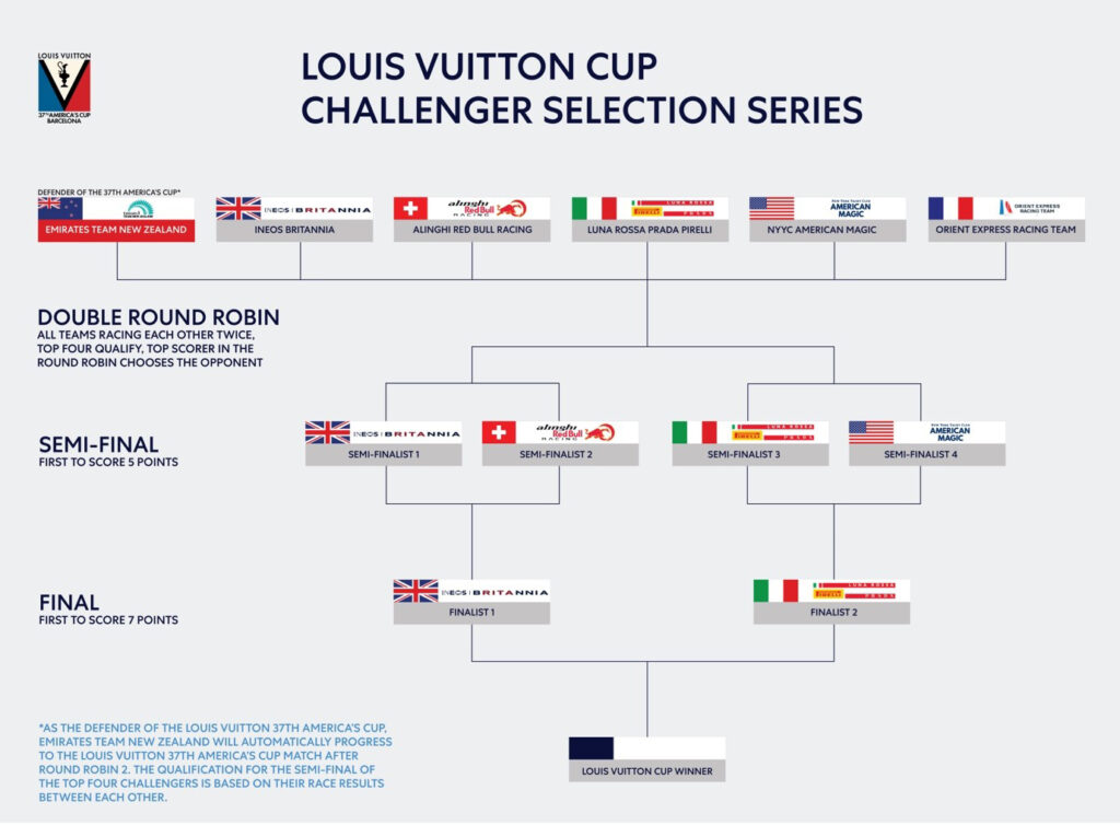 Η προκριµατική φάση που λέγεται Louis Vuitton Cup ανέδειξε τον διεκδικητή, µετά από µία σειρά ιστιοδροµιών, όλων των οµάδων. Στον τελικό κατάφεραν να φτάσουν οι δύο οµάδες INEOS Britannia και Luna Rossa Prada Pirelli, έχοντας αποκλείσει στο δρόµο τους τους Αµερικανούς, τους Γάλλους και τους Ελβετούς.